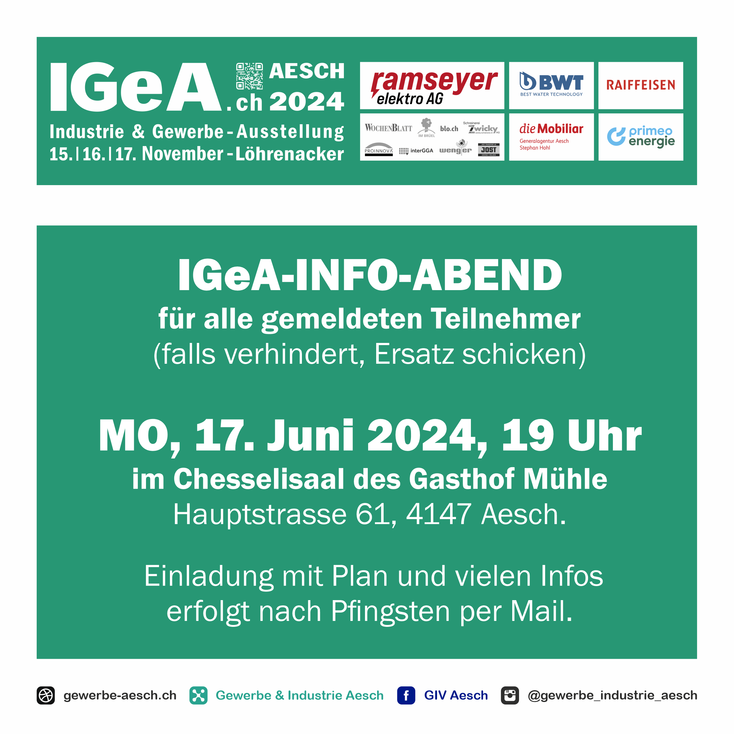Der Vorstand und das IGeA-OK sind bestrebt, baldmöglichst nach Beruhigung der akuten Situation ein Ersatzdatum für die Durchführung der Industrie- und Gewerbeausstellung anzusetzen und zu kommunizieren.
