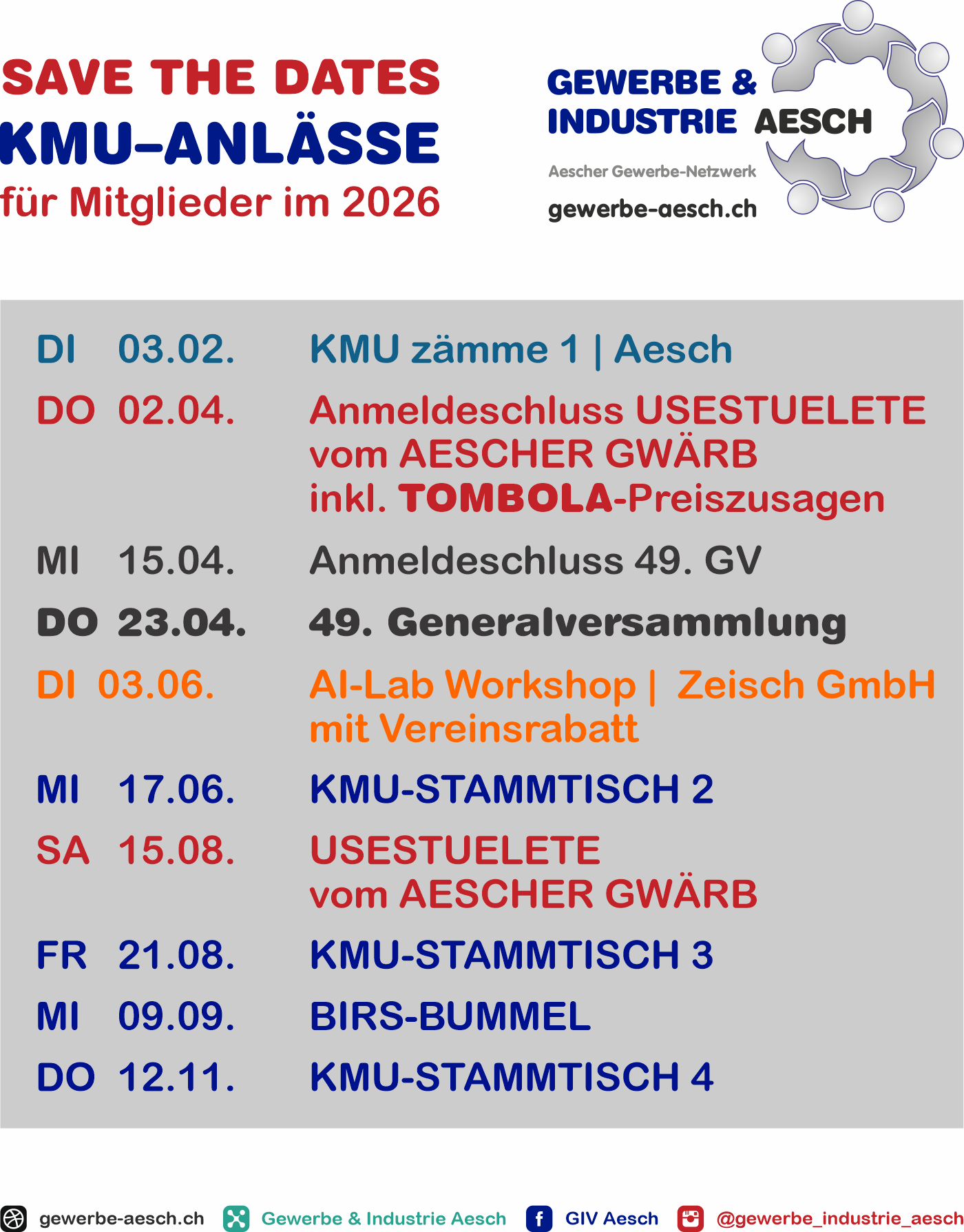 - DO 28. Mai 18 Uhr Infoveranstaltung AGIR26 (Teilnahme auch für Aescher KMUs im Sept. 26 möglich), Gemeindehaus Reinach mit Anmeldung
